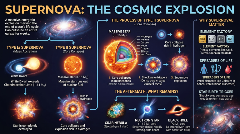 Mass Accretion (Type Ia): Occurs in binary star systems where a white dwarf “steals” matter from its companion star. If the white dwarf’s mass exceeds the Chandrasekhar Limit (approximately $1.44 M_{\odot}$), it explodes.
